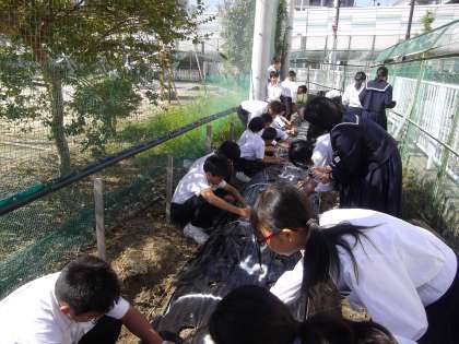 1年生の技術家庭科の授業で、「生物の育成に関する技術」の実習があり、16日火曜日に菜種を蒔きました。(17日水曜日は雨天で中止)