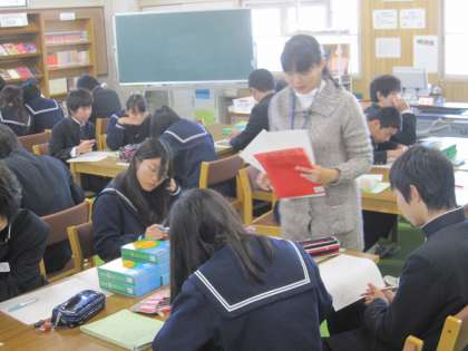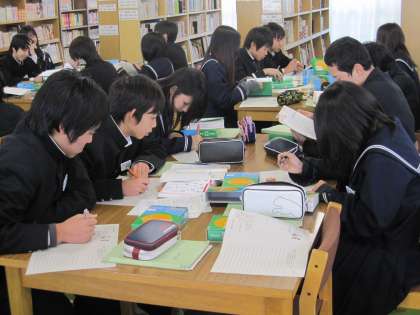「割り箸を禁止にすべきかどうか」を環境や文化などの面から、自分の意見を英語でまとめて表現する、という授業です。新しく図書室に入った英和・和英辞典を使いながら、英作文に真剣に取り組んでいます。