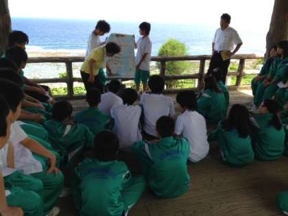 1組はガマから展望台に移動して、平和学習です。ガイドさんの話しが続きます。