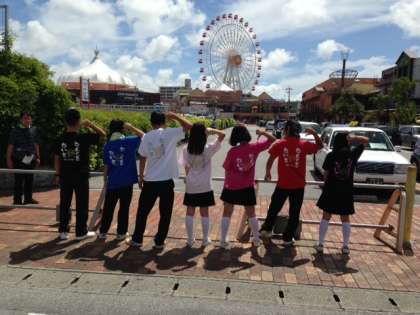 お土産に買ったお揃えのTシャツを、早速 試着しています。