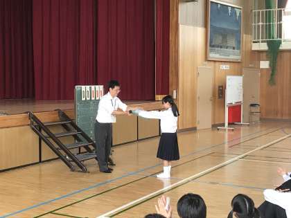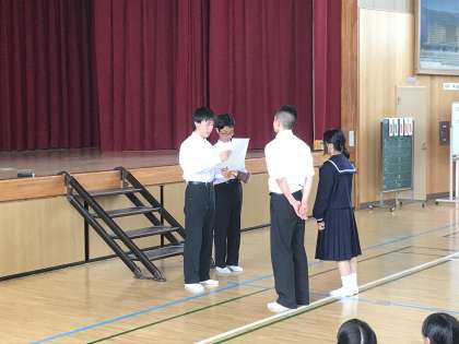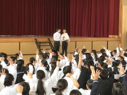 六時間目の総合の時間、1年生は前半体育館で学年集会を持ち、四月27日から取り組んでいた号令コンクールと、小学6年の時に描いた国際平和ポスターコンテストに入賞した人の表彰を行いました。後半は、各教室に戻って中間テストの勉強をしました。