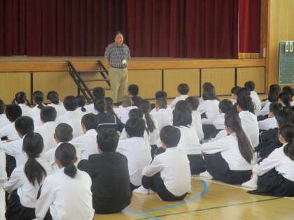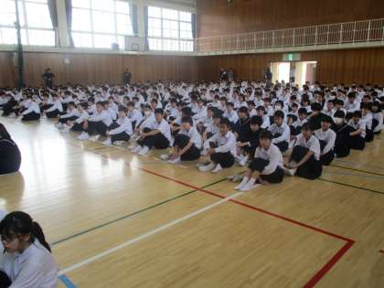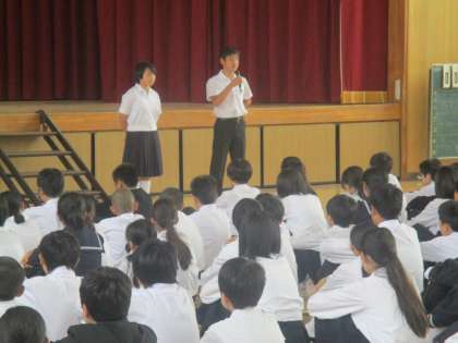 普段は火曜日の行う集会ですが、明日から中間テストを行う関係で今朝実施しました。集合時間を守る姿勢は今日も良かったです。1年生の整列が早くなってきました。生徒指導関係、イズミヤの解体工事に伴う登下校の注意、保健関係についてそれぞれ先生から話があり、その後、生徒会からも話がありました。