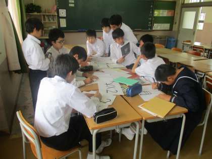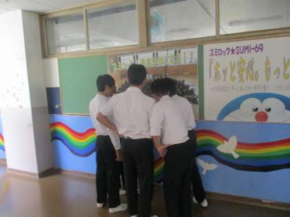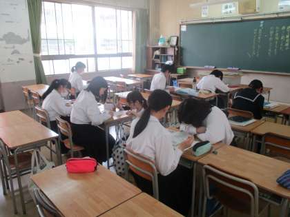教室野様子です。友だち同士で楽しそうに話をしている生徒、明日からのテスト勉強をしている生徒、林間学舎の係りの仕事をしている生徒たちです。