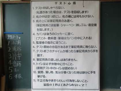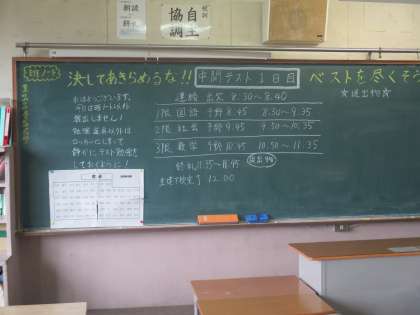 今日と明日の二日間は中間テストです。朝、生徒の登校前の教室の様子です。昨日中から教室整備をしている学級、気持ちよく生徒が力を発揮できるよう、朝、教室の喚起をしている学級の様子です。