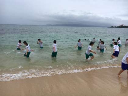 ビーチで遊んでいます。雨はパラパラ小降りです。