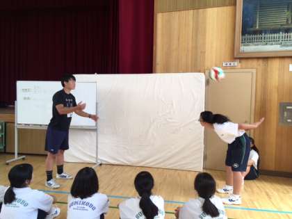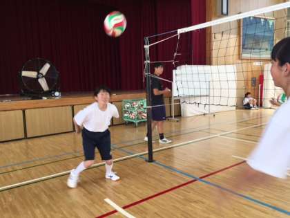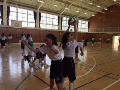 1年生女子の体育では、バレーボールを使って、オーバーハンドパスとアンダーハンドパスの練習を行っていました。授業のめあては「相手を思いやる」です。相手が受けやすいボールを工夫して投げていました。