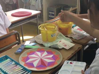 2年生の美術では「おぼん」を作成中。みなさん一生懸命です。