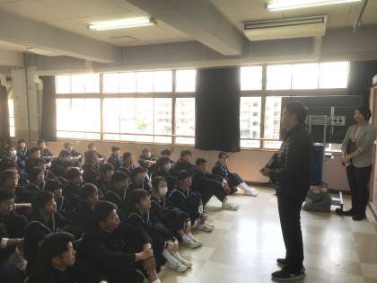 10日の3時間目、三年生は学年集会をもちました。三年担当の先生たちの自己紹介をみんな真剣に聞いていました。