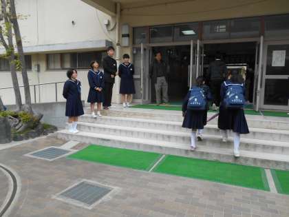 8時15分ごろの正門です。うれしいですね、生徒会役員の人と、吹奏楽部の人たちが「おはようございます。」と登校する生徒に声をかけています。すばらしい。