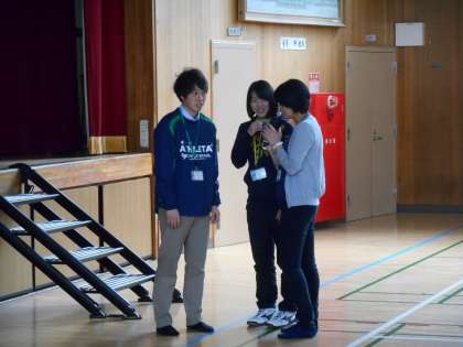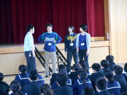 これは何をしているかというと、先生たちが生徒の役をやり、一人の生徒のことを残りの3人がヒソヒソ噂話をしています。それを感じた一人(机)の生徒が「俺のことをはなしてたやろ。」と怒ってケンカになっていくというストーリーを演じています。