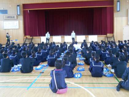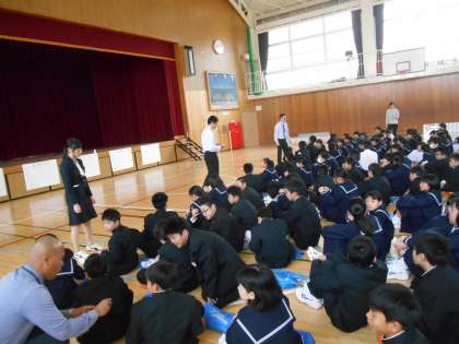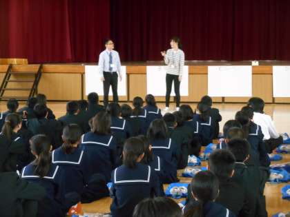 これも先生たちが何やら言い合いをしているお芝居(ロールプレイ)をしていました。それを見ていた生徒たちが先生から「ふせんカード」を2枚ずつもらっている写真です。