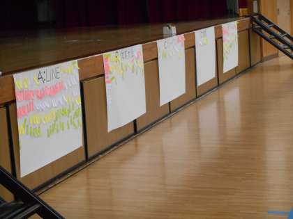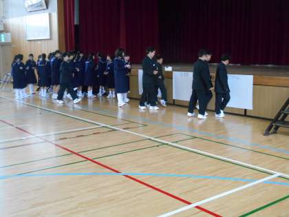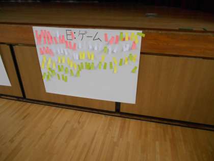 先生たちのロールプレイを見て、生徒たちが自分の思うところに付箋を貼るのですが、5枚のカードすべてに意見が分かれました。つまり、自分と人の考えはちがうということです。人それぞれに感じたり、考えることが違うことに気が付いてほしくて、ロールプレイをしました。