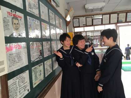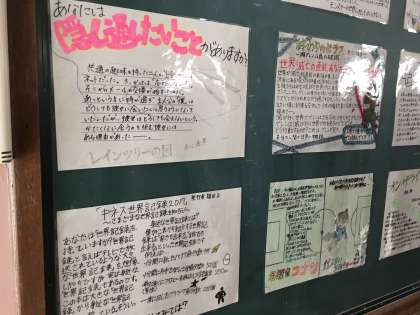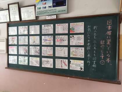 玄関横掲示板には、図書委員会が作成したポスターがたくさん貼られています。力作ぞろいですので、皆さんも一度ご覧ください。