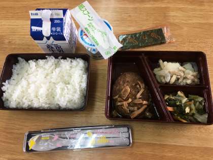 今日の献立は、白ごはん、照り焼きハンバーグ、じゃがベーコン、かつお和え、のり、ヨーグルト、牛乳でした。