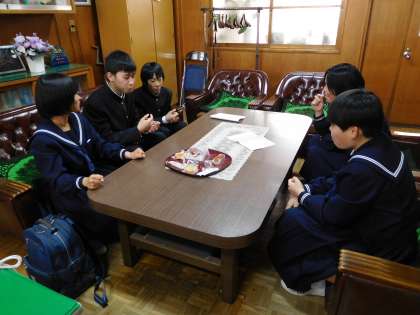 4月19日(木)は住道中学校の創立記念日です。創立記念日は学校の誕生日ですね。なんと今年で70歳になります。創立記念日の給食にお祝いデザートが登場します。入学式の後、生徒会役員のみなさんが3種類のデザートを試食しながら1つ選んでくれました。写真はその時の様子です。その結果、さつまいもと栗のタルトに決定しました。お楽しみに♪