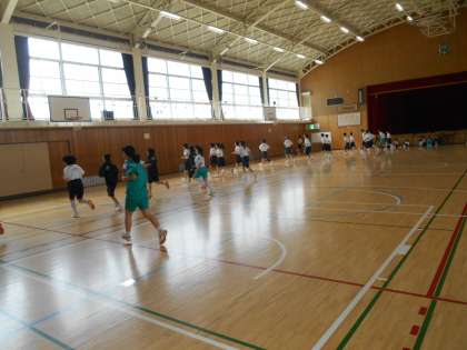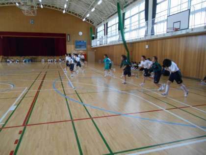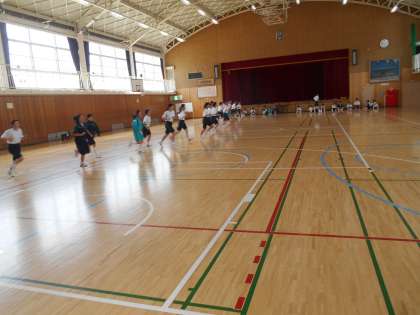体力測定のシャトルランをしているところです。写真を撮ったのは40数回往復しているところです。しんどいです。がんばっています。