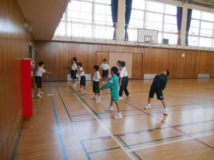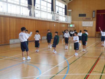 体育館で集団行動訓練を行っています。自分たちで号令をかけて元気よく体を動かしていました。