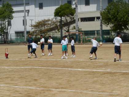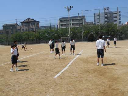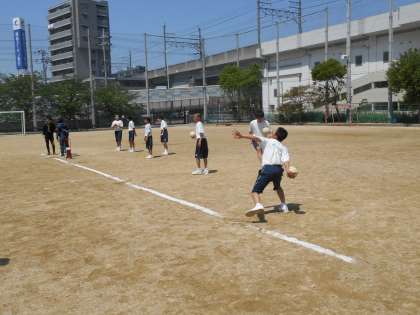 体力測定です。今日はハンドボール投げです。30数m投げる人もいました。