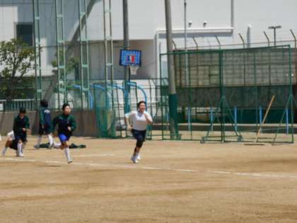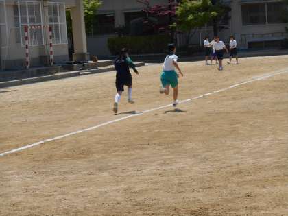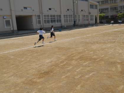 50m走を測定しています。「去年より速くなった人?」と先生が聞くと、多くの人が手を挙げていました。