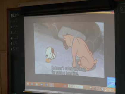 「NYの犬になりきろう」という授業です。アニメ(英語版)の吹き替えをみんなで練習していました。