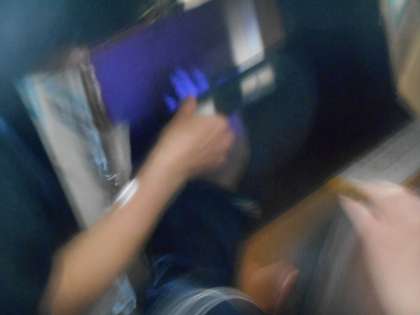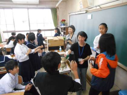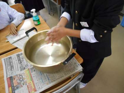 保健委員会の先生二人が「校長先生、今日の保健委員会はぜひ見に来てください。」とのことで、飛んで行ってみると、適当に手を洗った人と、きれいに手を洗った人の手を特殊なライト(3枚目)にあてます。すると、美しい手は一目瞭然、一目で分かります。みなさん、手をしっかり洗いましょう。
