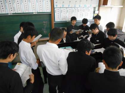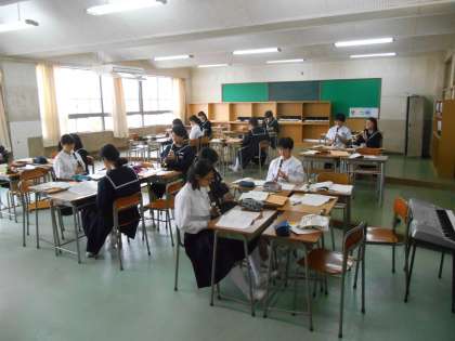 男子がピアノの周りで歌唱練習、女子が席でリコーダーの練習をしていました。