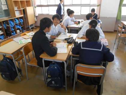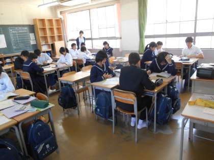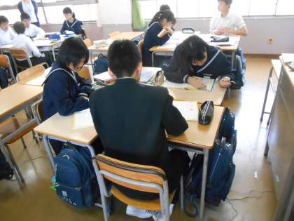 3年の英語は分割授業にしています。分割授業というのは、一つのクラスを二つに分けて少人数で授業を行うことです。もちろん、各一人の先生が教えます。