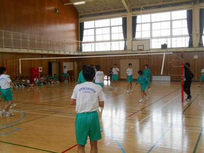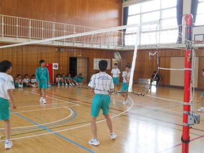 男子はふつうのバレーボールを使用しています。ナイスサーブがありました。