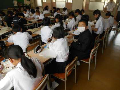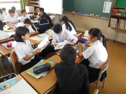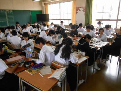 自習時間なのですが、ふだんから周りの人と意見を交わしながら授業を進めているので、私が行ったときには、互いに問題を出し合っていました。これはすごく効果的な勉強です。