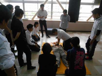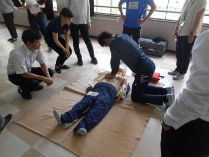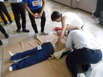 中間テストの午後、心肺蘇生法とAEDの使用法について研修会をもちました。年間6万人が心臓突然死で亡くなっているそうです。