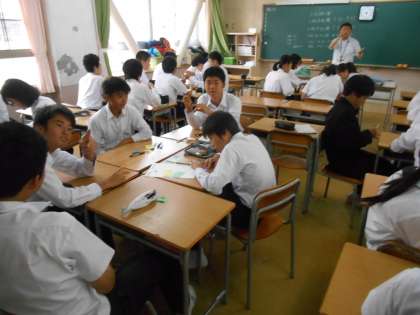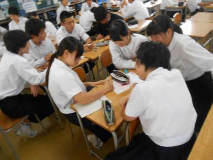 中間テストが終わり、生徒たちはさぞかし、やれやれと思っていることでしょう。テスト後の3限は3年生は修学旅行先の宿舎に掲示する自己紹介カードを作っていました。