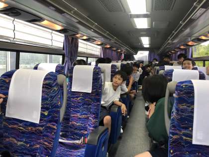 我慢できずに、バスレクが始まりました。列対抗のしりとり合戦です。