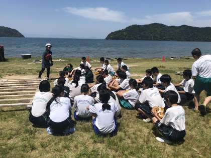 いかだ体験が始まりました。それぞれクラスに分かれて、説明を受けます。