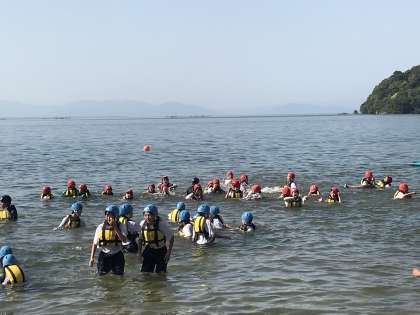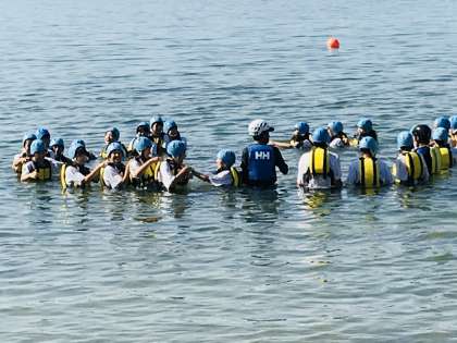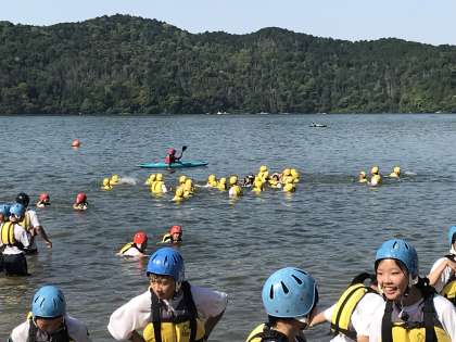 写真が後先になりますがすみません。いかだ体験がとてもスムーズに進み、ふだんはできないPFD体験をさせてもらいました。それはライフジャケットを着用して水の中で自由に動くというものです。最後は水遊びになりました。とても楽しそうでした。