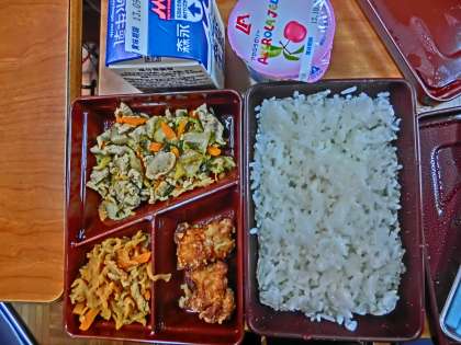 今日の給食です。先日のテフロンの異物混入(住中では確認されていません。)を受け、もずくスープがアセロナゼリーに換わりました。