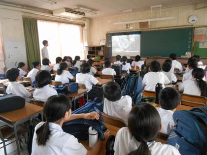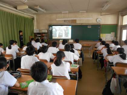 1年生は給食をつくっている向上の様子をビデオで見ていました。