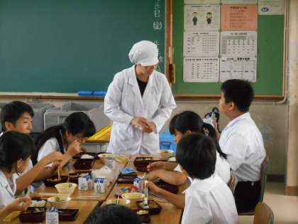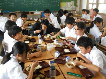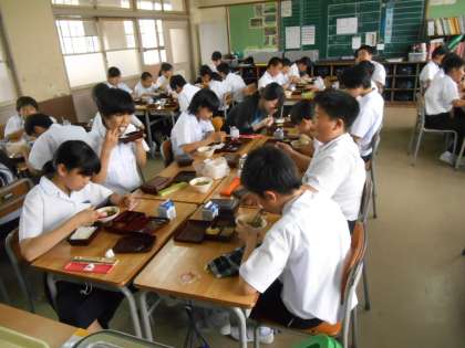 担任の先生や実習生の先生が生徒の班でいっしょに食べています。微笑ましいです。今日はカレーととんかつです。大喜びの生徒も多かったのではないでしょうか。栄養教諭の先生もお代わりのこと、栄養のこといろいろ教室を回って、話していました。食事は大事です。
