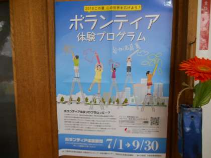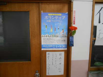 校長室の前に貼ったちらしです。大東市社会福祉協議会から配布されたものです。ボランティアに興味のある人は一度校長室前のチラシを見にきてください。