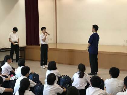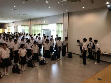 ちょうど5時に全員が宿舎に到着しました。整列点呼を速やかに済ませ、入館式です。担当の生徒がきびきび進めていました。すばらしい。