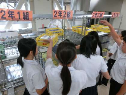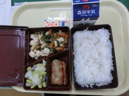 今日の給食は小松菜チャンプー、ちくわの竜田揚げ、ポテトサラダでした。