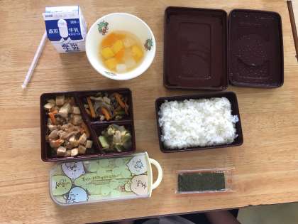今日の献立は、白ごはん、マーボードーフ、こんにゃくのチャプチェ、白菜のおかか、のり、フルーツナタデココ、牛乳でした。