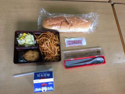 今日の献立は、コッペパン、スパゲティナポリタン、チキンナゲット、キャベツとコーンのサラダ、いちごジャム、牛乳でした。