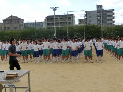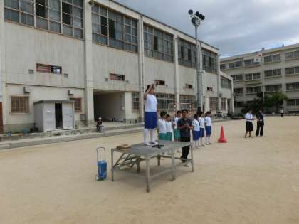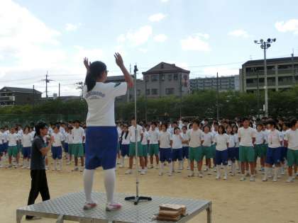 校歌の指揮者が朝礼台の上で手を挙げると、全員が足を開きます。これだけで「おっ、さすが。」となります。校歌の練習。正面の3年がものすごく大きな声で歌います。感動です。