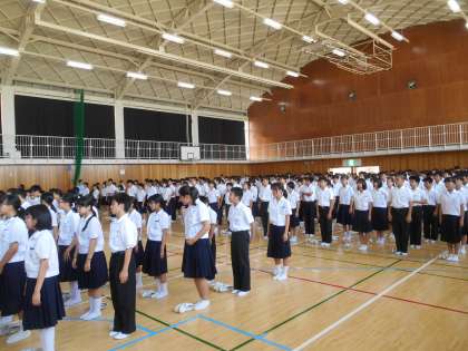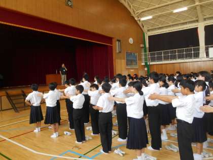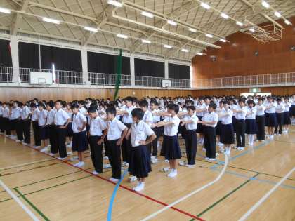 今日の朝礼は、校長から先日の地震の朝の登校時に小学生を公園の真ん中に誘導したことに先生全員で「すばらしい〜。」と大声で言いました。もう一つ、クラブの公式戦で救急車が本校に入ってきたのですが、そのときグラウンドでクラブをしていた人たちが走って来て、防球ネットを動かしてくれたといううれしい話を紹介しました、。すばらしい。