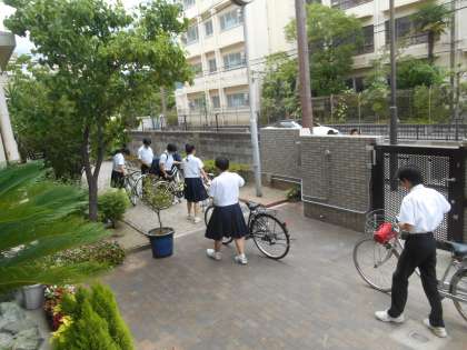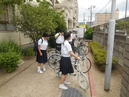 今朝は生徒会役員の人たちが泉小のあいさつ運動に行きました。自転車を使って移動しました。