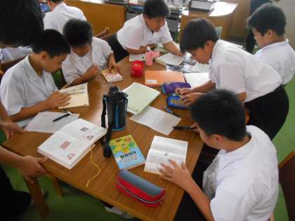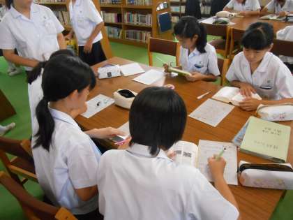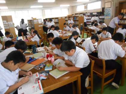 写真は昼休みの図書館です。住中の歴史上トップクラスに入る最多人数を記録していました。理由は、午前中に行った図書館クイズの続きをしたくて1年生が殺到しました。すばらしい。