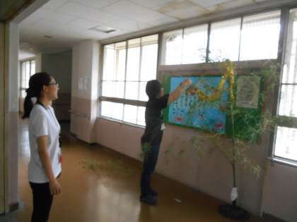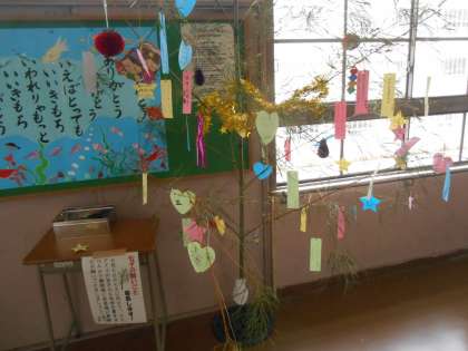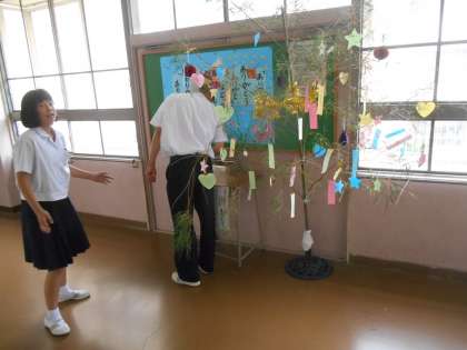 中学生も夢はもちたいものです。先生たちが用意し、さっそく生徒たちが願いごとをぶらさげていました。校長は「住中大好き」と書きました。