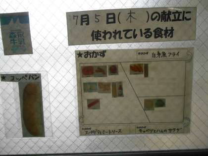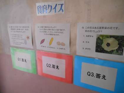 栄養教諭が毎日食材を紹介しています。横には給食クイズが出されていて、なんだかんだと言い合っています。これがなかなか難しいのです。