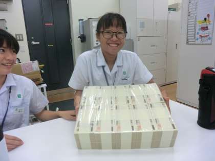 なんと、本物のお札。一億円をさわらせてもらったそうです。生きている間に一度触りたいです。