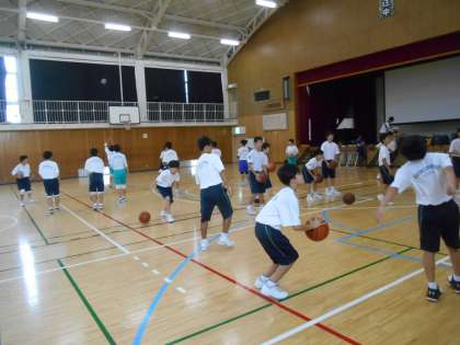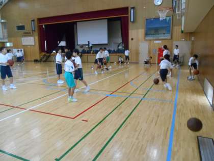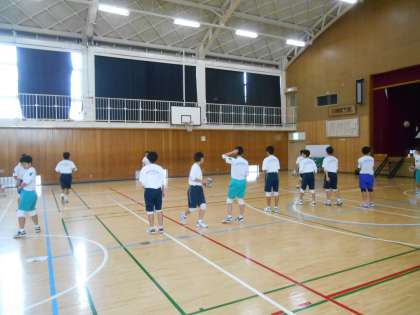 台風で体育館をつかえるのは半分です。今日はバレーと男子バスケです。